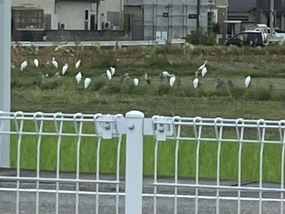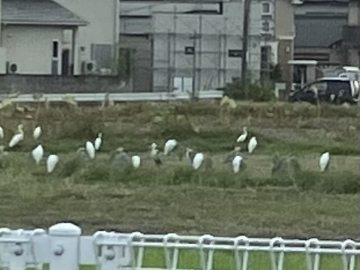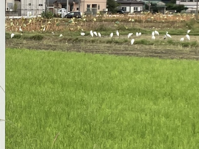 そんな帰りの午後、スーパーに寄ったら そばの畑にまた、鳥がたくさん降りて集まっている。 シラサギと、少し灰色のアオサギも混じっている。 エサを啄んでいるとか、探して歩き回っている、 というのでもなく、ただただ、集まっているように見えた。 こちらの地区では集会はこの時刻だったらしい。