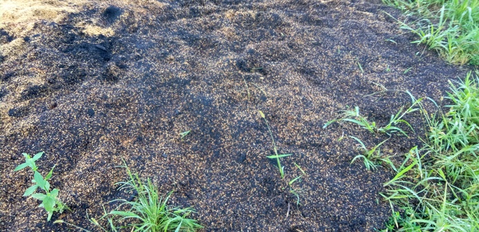写真は出来上がった燻炭。 薄く広げて水をかけた状態。 乾燥後、袋詰めする予定。