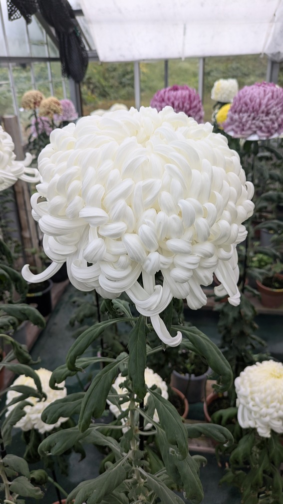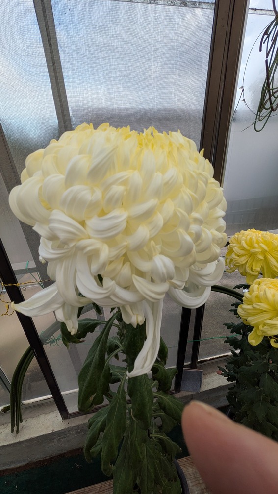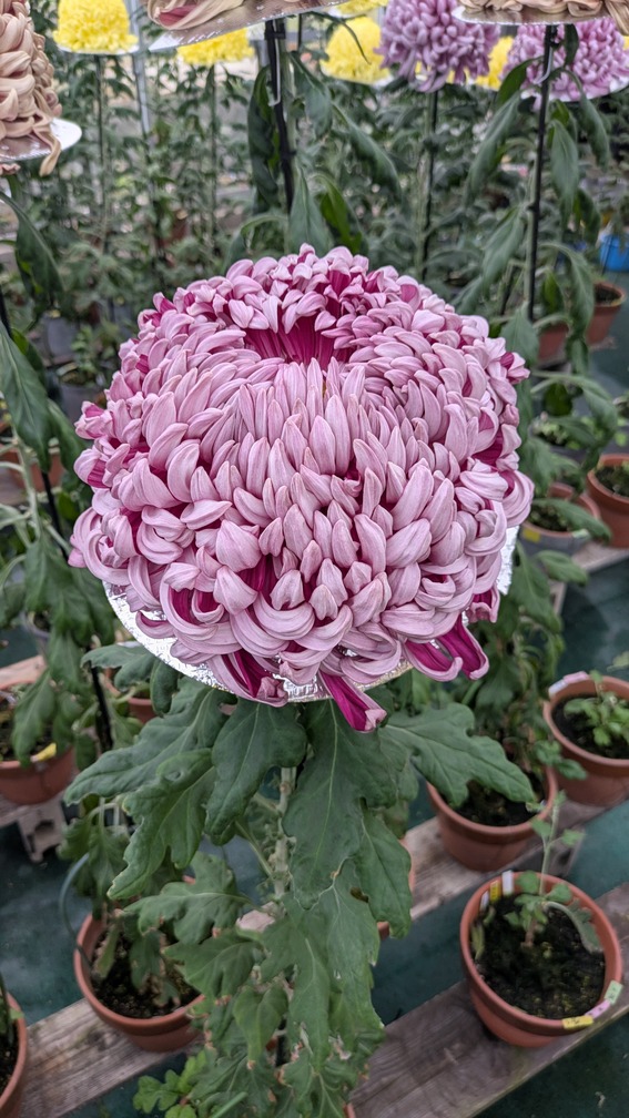 晴れのち曇り 今年の普及花は春から全然期待していなかった。 ところが開花するにつれ結構良い花があるのを気付かされた。 まず天照 カタログ写真より弁質が良く輪径も出そう。 三谷と紅蓮、臥龍は期待外れ 寿亀は苗間違いで牙城が送られて来た。 寿亀(実際は牙城)は3日咲きとあったのでシェードを遅くしたので大会に間に合わず。それでも超巨大に咲いた。 次に良かったのは総本山。 何しろ巨大に咲いた。もう少し弁数が多ければこれからも残したい花かな。 全く期待していなかったのが熱血。 カタログ写真ではシワ弁と色彩が悪い。 2m越えだったので脚立の乗って見ることもなかった。 今朝初めて見ると超巨大花に咲いている組も悪くない。 勿体ないことをした。 期待していた雪華も苗間違いが? 中菊に咲いた。、