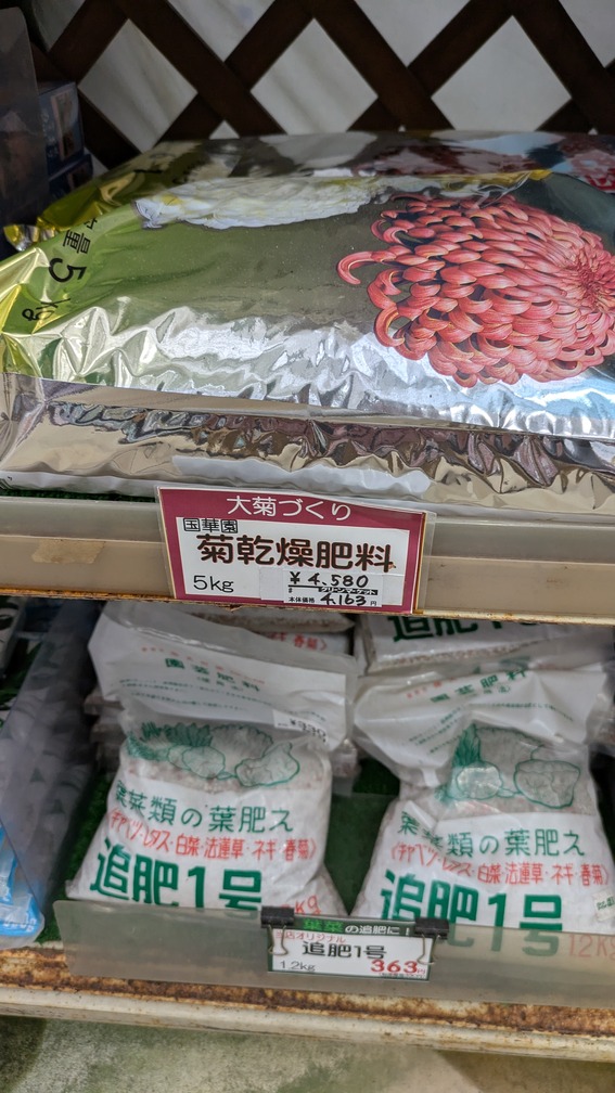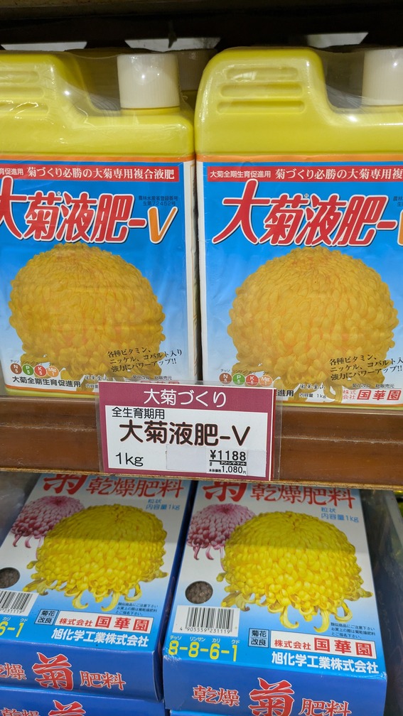 雨 地元菊花大会の表彰式は28日 例年は副賞としてトロフィーやカップを授与する事が多かった。 近年は「菊資材の方が嬉しい」と言う声が多くなった。 新聞社等共催企業から貰うカップは別として、 会で用意するものは肥料等にする事に決めた。 今年は国華園の資材で用意する。 何時も利用する大型園芸店では国華園の資材も多く扱っているし安価だけど、最強液肥等は扱っていない。 一応国華園に10万円弱の注文をしたが少しでも安くしてくれないかな。