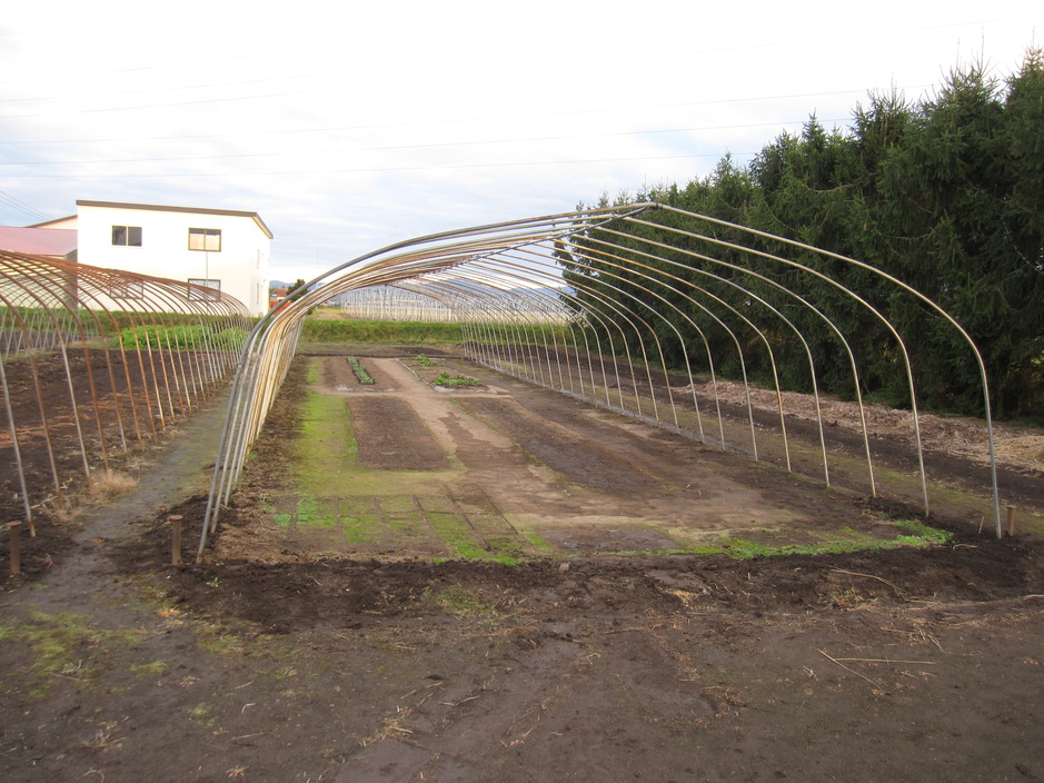 菊ハウスのビニールを片付け、褄面、横直管など全部終わりました。