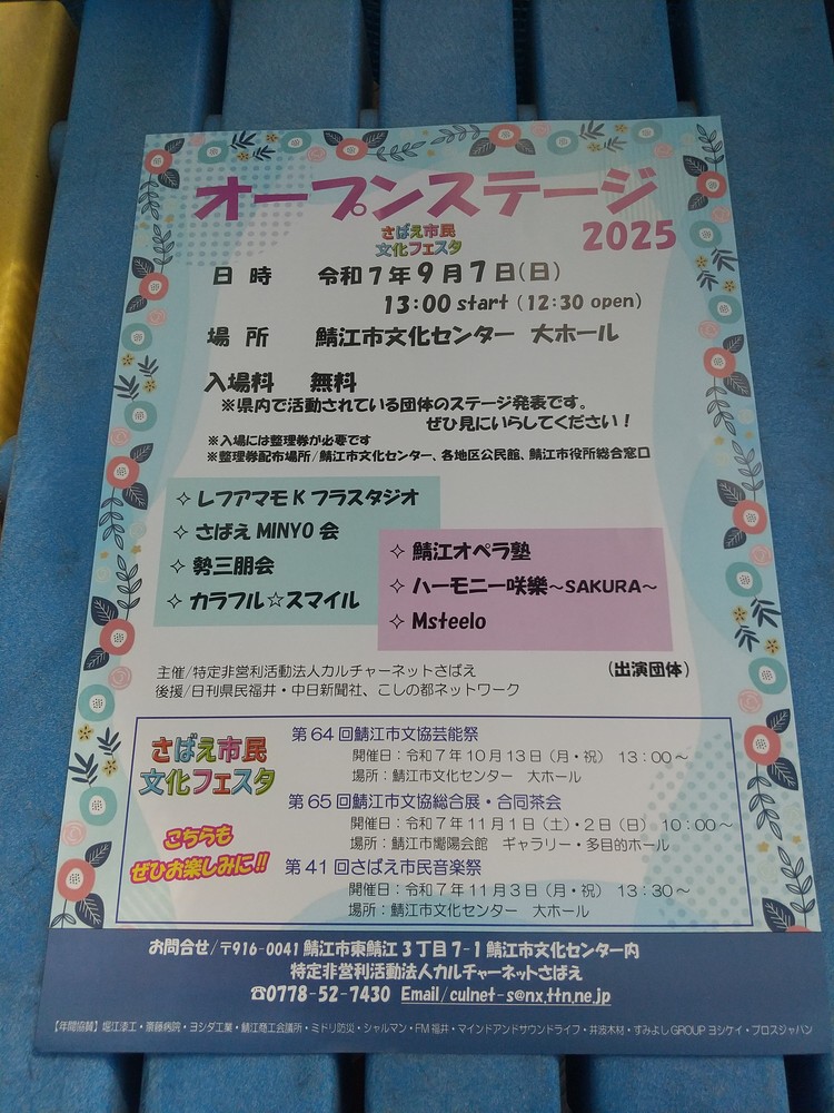 今日はバイトを入れてません。血尿でなかったら鮎釣りに行っていたのになぁ!鮎釣りにも行けないし、菊作業にはまだまだ暑い。妻から観にくるように言われました。妻が所属する鯖江オペラ塾も出演します。ほんの15分位だそうですが、、、、行ってきます。