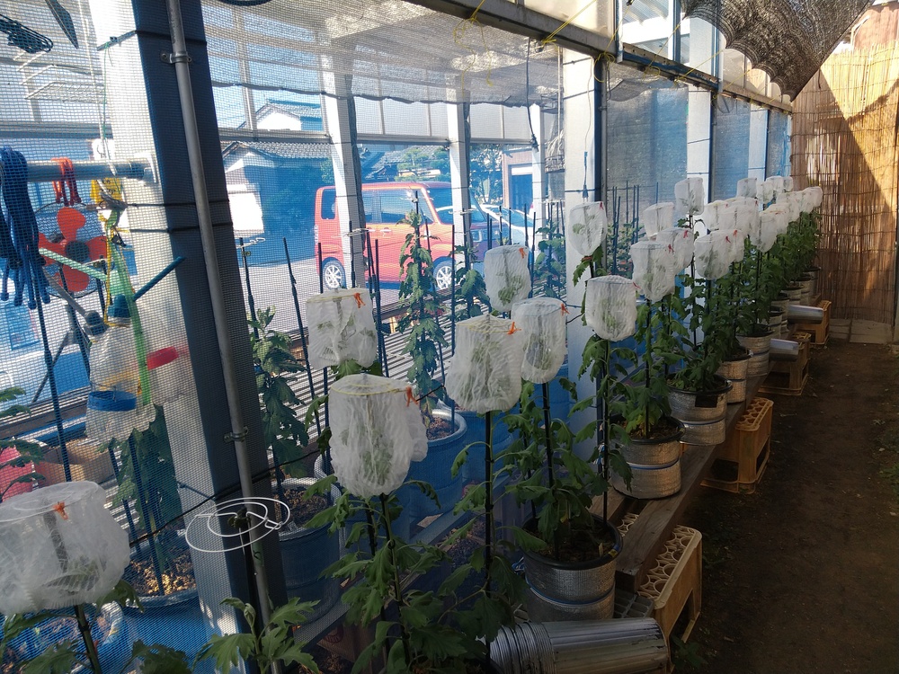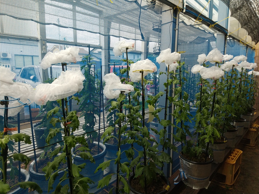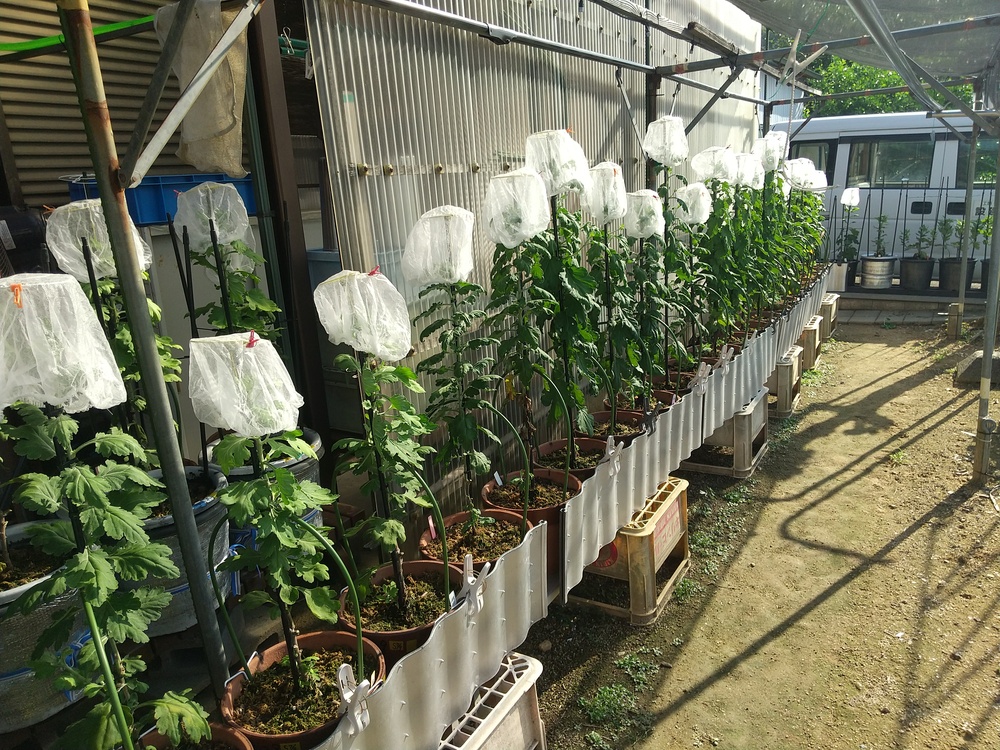 不織布水切袋のデメリツト。それは、消毒の時に袋をめくらなければいけないことです。今朝の消毒は大変でした。切り花用なら袋は一鉢で1個ですが盆養なら3個。両手を使うのでかなり面倒。消毒が終わればまた元に戻します。
