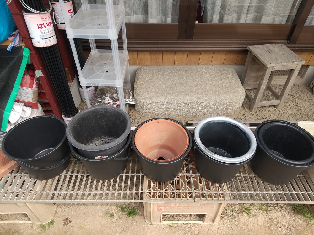 (1) 中に入っている鉢。 右側から、8号鉢、私の使っている9号鉢、9号駄温鉢、国華園の9号鉢です。