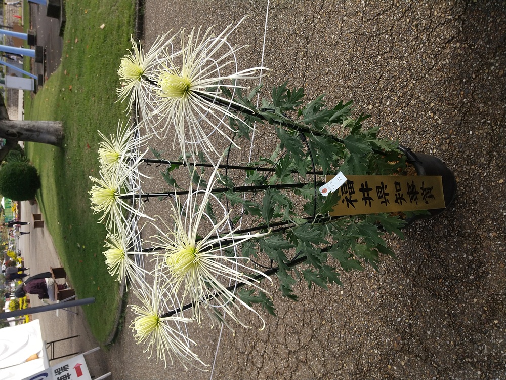 今年も開花が遅れました。賞なんてもらえないだろうなぁ、、、って思ってました。でも、私の願いが通じたのか、、、審査当日、やや見られるようになりました。泉郷高峰に救われました。北陸三県菊花コンクール。7本仕立ての部 第2位 福井県知事賞、、、幸運でした。